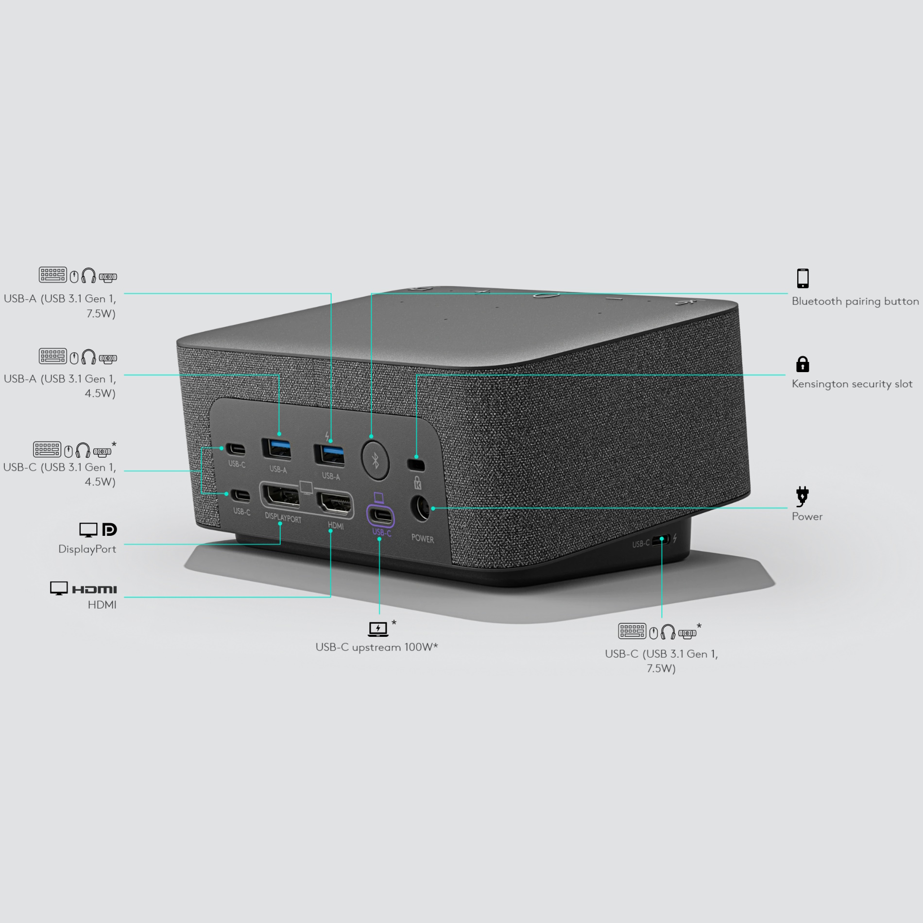 Logitech Logi Dock Docking Station – for Desktop PC/Tablet/Smartphone – 100 W – USB Type C – 2 Displays Supported – 4K – 3840 x 2160 – 5 x USB Ports – 3 x USB 3.1 Type-C Ports – 2 x USB Type-A Ports – USB Type-A – 4 x USB Type-C Ports – USB Type-C – 1 x HDMI Ports – HDMI – 1 x DisplayPorts – DisplayPort – Speakers – Wired/Wireless – Windows, macOS, ChromeOS, iOS, Android